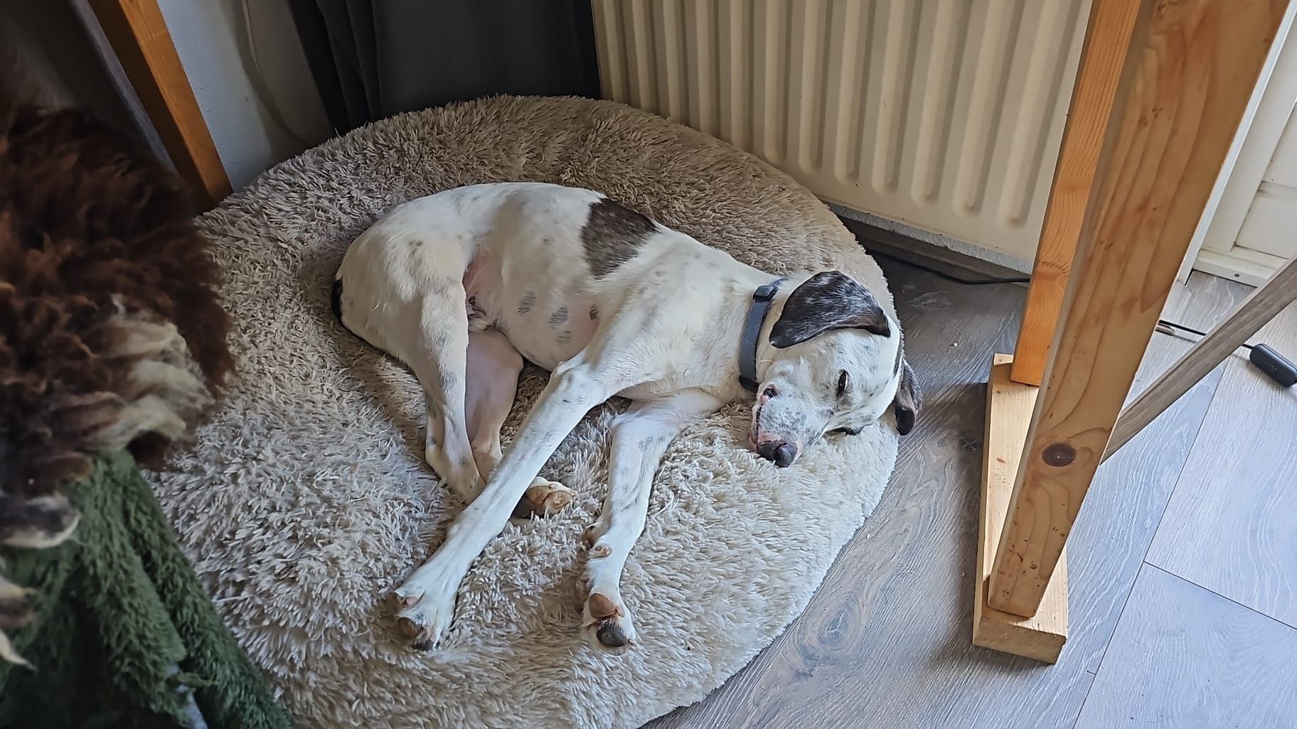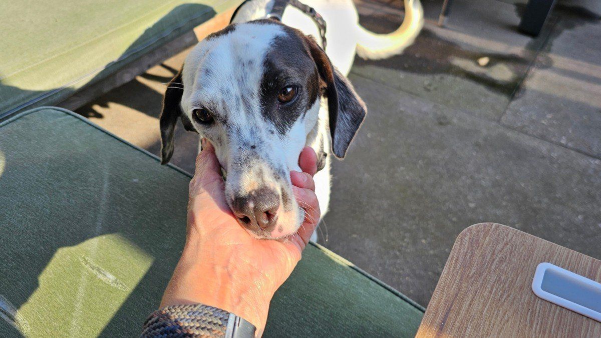 Melchior sluit je door zijn zachtheid meteen in je hart en misschien komt dat ook wel een beetje door die lieve sproetensnuit van hem.. Maar wat ook daaraan bijdraagt is de voorzichtige manier waarop Melchior zijn nieuwe wereld verkent. Echt wel aandoenlijk om te zien hoe graag hij wil, dan ronddrentelt net of hij moed moet verzamelen en als het dan veilig voelt de stap in zijn wenproces zet. Inmiddels komt hij lekker uit zichzelf kwispelend een aai onder zijn kin halen bij zijn gastbazin, geniet ervan en loopt dan met een losse kwispelstaart voldaan weer naar het kussen waar hij ook wel erg van geniet ;). Melchior slaapt ook veel bij het gastgezin, heeft hij duidelijk nodig. Wel fijn dat hij dat doet, er is ook veel te verwerken voor hem. Melchior schrikt namelijk nog snel van alles, heeft een gevoelige en dus zachte inborst. Bij het gastgezin gaat hij wel snel vooruit in het vertrouwen, door hem rustig en met beleid te begrenzen in het willen weglopen voor iets dat hij eng vindt.